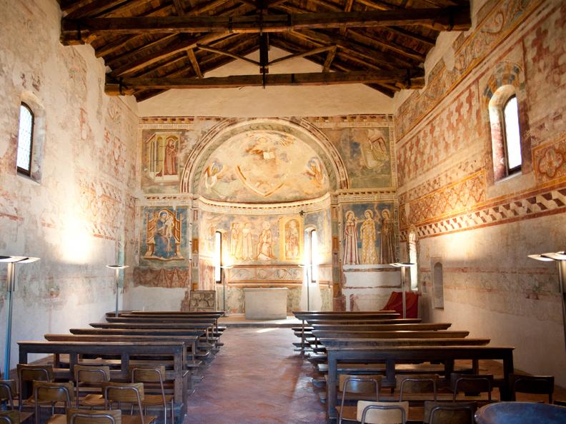 Sull’arcata dell’abside, nel registro superiore, un’ Annunciazione; in quello inferiore Vergine con Bambino e tre Sante (Agata, Caterina e Agnese). Sulle pareti dell’abside la Majestas Domini e le storie di S. Pietro. Si tratta di opere di autore ignoto della prima metà del Trecento.