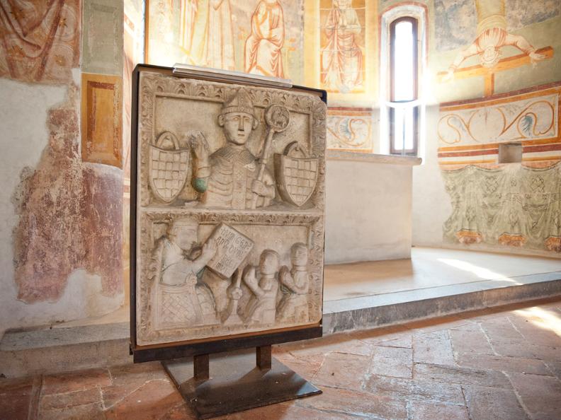Nello zoccolo è dipinta una cortina. La data di consacrazione della chiesa, 1345, è ricordata dall’incisione che corre sul labbro della mensa d’altare.