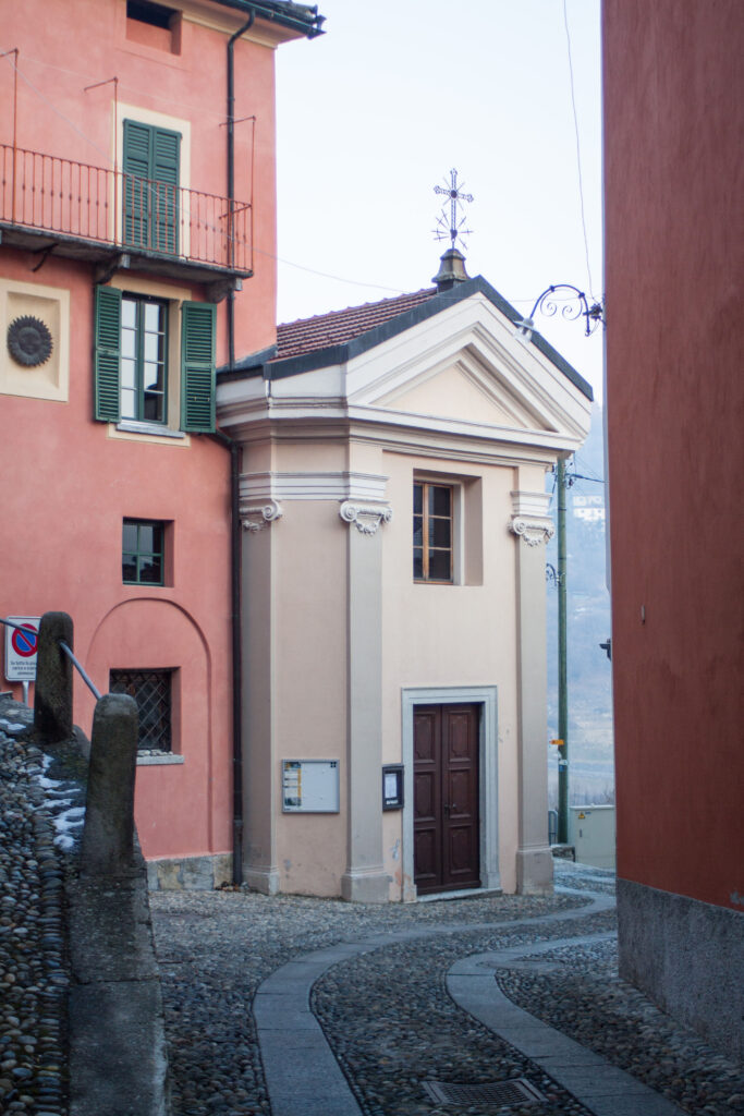 Edificio neoclassico eretto inglobando una più antica costruzione (nota dal 1619) a partire dal 1789, dopo la separazione dalla parrocchia di Cabbio (1788); consacratoi nel 1823.