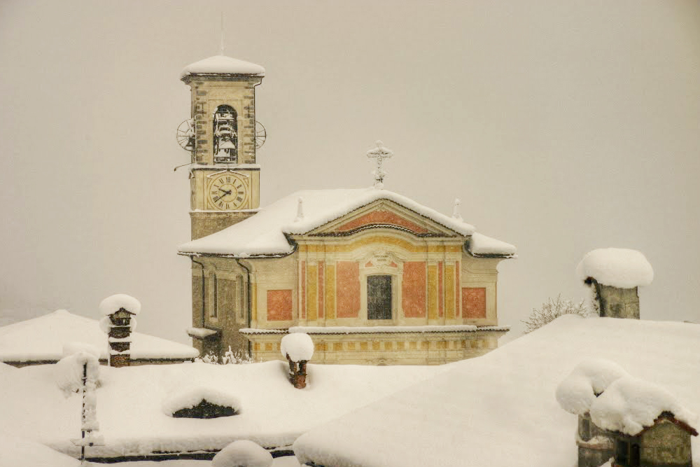 Il campanile, esile rispetto alla chiesa, è ancora l’antico, costruito nel 1599. Nel 1614 si annotano vendite di terreni per l’erezione della torre campanaria (Arch. Maggi) che fu sopralzata dopo il 1705. Le campane attuali sono state fornite dalla ditta Bizzozzero di Varese.